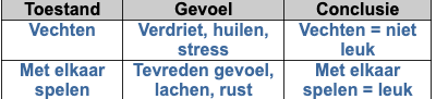 Ook het uitleggen dat vechten minder leuk is voor kinderen dan fijn spelen, geeft de kinderen een reden tot nadenken. Kinderen kunnen best begrijpen dat vechten of iets afpakken vaak tot huilen lijdt en huilen is niet leuk voor de kinderen, dit is een uiting van verdriet. Verdrietig zijn is op zich niet leuk dus kinderen begrijpen, als ze iets verkeert doen, dat je verdrietig wordt en weten, als je goed met elkaar om gaat, dat je dan vrienden maakt.