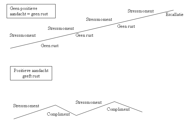 Als men nu het stressniveau van het kind kan verlagen door rustig op het kind te reageren en bijvoorbeeld iedere keer als er iets goed gaat een compliment te geven dan zal escalatie een stuk verminderen of zelfs uitblijven. Het kind krijgt meer zelfvertrouwen en wordt rustiger. De kinderen hebben dan meer rust om de volgende taak goed te kunnen volbrengen. Als men het aantal stressmomenten reduceert, dus over de hele dag genoeg positieve aandacht geeft zodat het kind meer zelfvertrouwen krijgt, zal het kind een stuk rustiger worden en kan het beter met stressmomenten omgaan. Het zal dan rustiger worden in de groep.