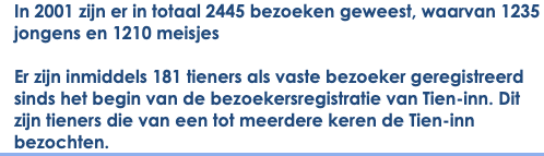- Vanaf januari 2001 is de Tien-inn iedere werkdag open voor de tieners, er wordt gewacht op vaste klanten die met een contract willen werken. De entree is fl. 7,25 per uur en de respons is daardoor minimaal. Ook een vaste binding aan de tieneropvang staat de tieners tegen, ze hebben liever een open inloop zodat ze kunnen komen wanneer ze willen.