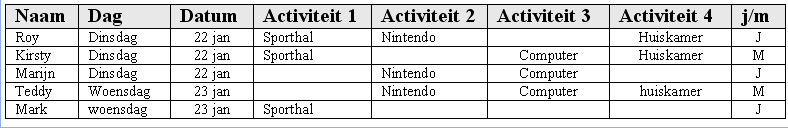Als elke dag de tieners zich melden als ze binnenkomen dan kun je dat in een tabel bijhouden. Het leuke van deze tabel is dat je nadien kunt zien wat de tieners leuk vinden aan dagelijkse activiteiten zodat je weet waar er misschien extra tijd of geld ingestoken moet worden. Het is in deze tabel niet belangrijk om alle gegevens van de tiener op te schrijven, die heb je tenslotte al in de adressen tabel, het is echter wel handig om de voornaam van de betreffende tiener op te schrijven zodat je die als geheugensteuntje kunt gebruiken.