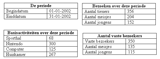 De lijst van het aantal tieners en basisactiviteiten en de lijst met de persoonsgegevens van tieners is verschillend, het verschil is dat iedere tiener meerdere keren naar de tieneropvang kan komen. Dus het absolute aantal tieners is het aantal tieners dat is geregistreerd in de tabel bij de persoonsgegevens, terwijl het aantal bezoeken de tieners zijn die een of meerdere keren van de tieneropvang gebruik hebben gemaakt, deze zijn geregistreerd in de tabel aantal tieners en basisactiviteiten, dus het totaal van het aantal bezoeken die de tieners aan de tieneropvang hebben gebracht.